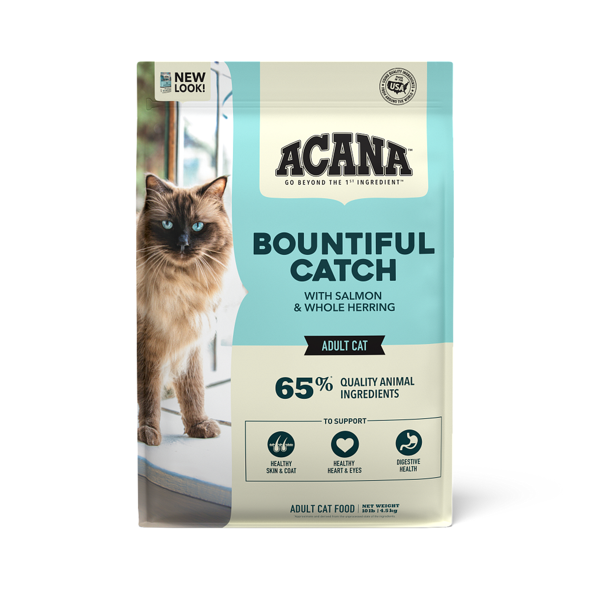 is a nutrient-dense, fish-based dry food specifically formulated for adult maintenance. It features 65% quality animal ingredients, including wild-caught salmon, whole herring, and rainbow trout, designed to support heart, eye, and skin health.