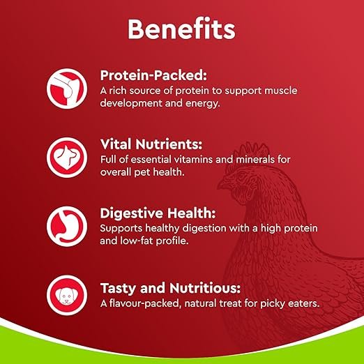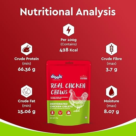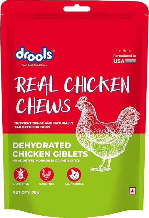 The Drools Dehydrated Real Chicken Giblets Chews Treat for Dogs is a high-protein, natural, and minimally processed dog treat made from human-grade chicken liver, heart, and gizzard. It is designed for dogs of all ages and sizes.