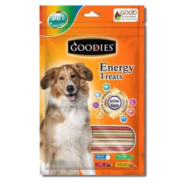 Goodies Energy Treat is made from vegetable protein which is perfect for dogs. It is suitable for all breeds and ages of dog with high quality ingredients, its texture can be flexible and fun to chew by you dog. Goodies Energy Teat is not only facilitates the oral cleaning process naturally but also added supplements such as Chlorophyll, Calcium, Bromelain Enzyme and Fructo-Oligosaccharide to ensure your dogs have good healthy life.