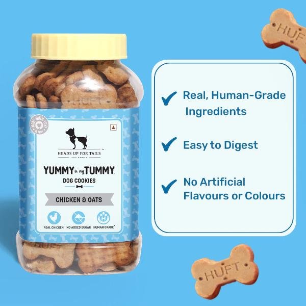 Your search ends here! Health meets taste in HUFT Yummy In My Tummy dog biscuits. Unlike other dog biscuits, ours contain no artificial flavouring or colours, harmful maida (refined flour) or processed sugar. These biscuits are made with only 100% real, human-grade ingredients like fresh chicken, slow-dried chicken liver powder, oats, atta (whole wheat flour) and rice flour, along with lots of love and care!