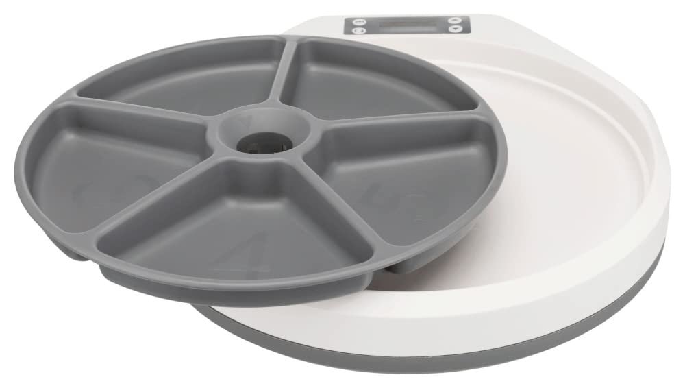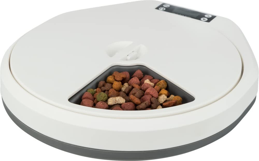 The Trixie TX4+1 (TX5) is a white and grey automatic pet feeder that allows you to program up to 5 meals (4 scheduled + 1 immediate) for cats and small to medium dogs. It is designed for both wet and dry food and features a rotating tray with five 240ml compartments.