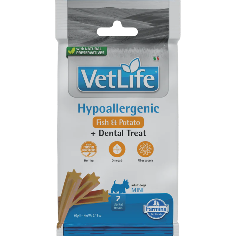 Dental Treats: Specifically formulated “Mini” treats (approx. 60g) designed for dental health in small dogs.