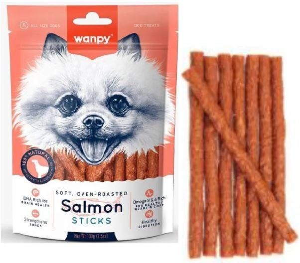 Wanpy Soft Oven Roasted Salmon Sticks Dog Treats are ideal treat or training reward, these salmon sticks are all natural, high in protein and low in fat. Features & Benefits All natural Resealable bag for freshness Perfect for a reward in between mealtimes (not to be substituted for meals).